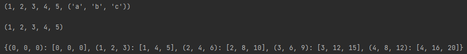 my_dict = {(i, i * 2, i * 3): [i, i * 4, i * 5] for i in range(5)}