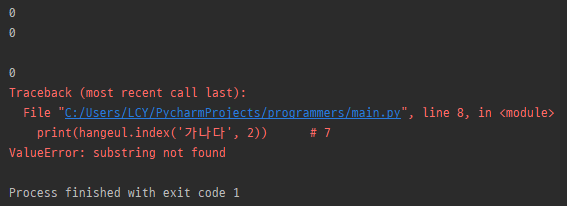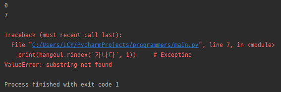 print(hangeul.rindex('가나다', 1)) # Exceptino