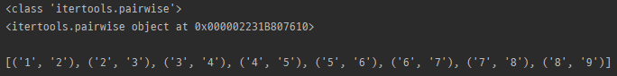 | pairwise | iterable | - 연속하는 두개의 요소를 튜플로 묶어줌 - '연속하는 두개'의 모든 가짓수 반환 |