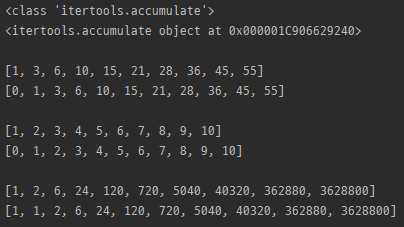 | accumulate | iterable[, func, *, initial=None] | - 누적 합계를 반환하는 이터레이터를 반환 - func에 합계 대신 다른 함수를 넣을 수 있음 |