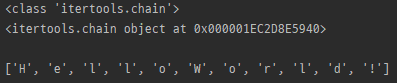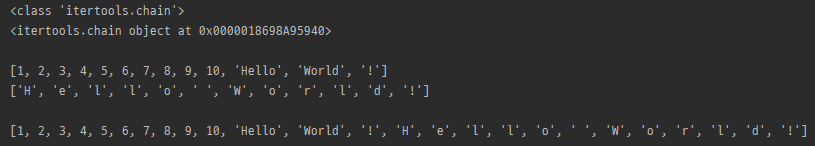 | chain | *iterables | - 여러 iterable을 연달아 반환 |