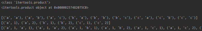 - 가능한 모든 조합의 tuple을 반환하는 이터레이터 반환