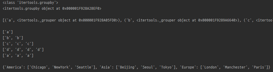 | groupby | iterable, key=None | - (key, iterator) 형태의 튜플을 반환하는 iterator 반환 - key 값을 기준으로 group된 요소를 반환하는 이터레이터 |