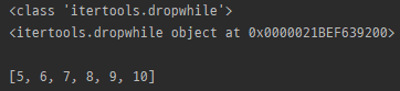 | dropwhile | predicate, iterable | - predicate가 false인 요소부터 요소를 반환 - takewhile의 반대 |