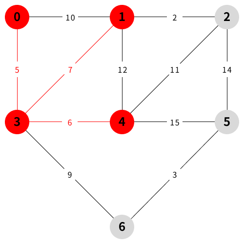 - T에 있는 노드와 T에 없는 노드 사이의 edge 중 weight가 최소인 edge를 찾는다